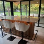 Bar voor binnen in een tuinkamer. Op maat gemaakt met led verlichtingBar op dakterras op maat gemaakt van fraké hout en HI-MACS
