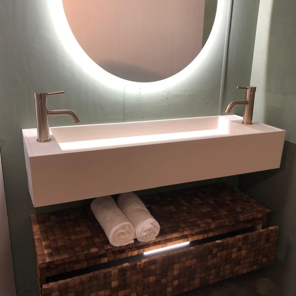 Maak kennis met Ecologisch – een uniek badmeubel dat natuur, vakmanschap en duurzaamheid samenbrengt. Dit meubel is vervaardigd uit kokosnoot-schil-panelen, een innovatief en milieuvriendelijk materiaal dat een warme, organische uitstraling geeft.