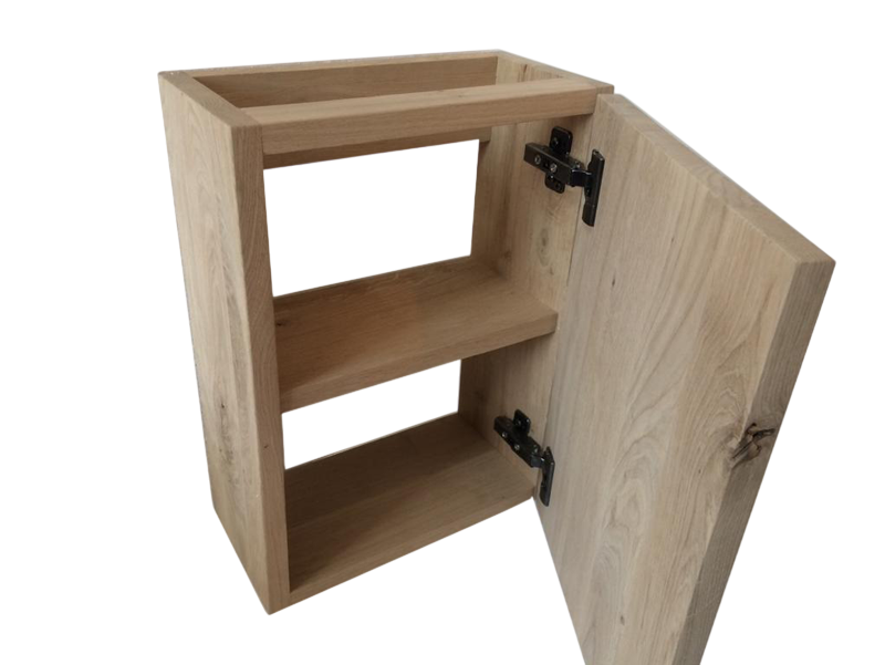 Onze eikenhouten toiletmeubel worden volledig op maat gemaakt. Geef je gewenste afmetingen eenvoudig door via de contactknop. Elk meubel is standaard voorzien van een praktisch schapje voor extra opbergruimte.